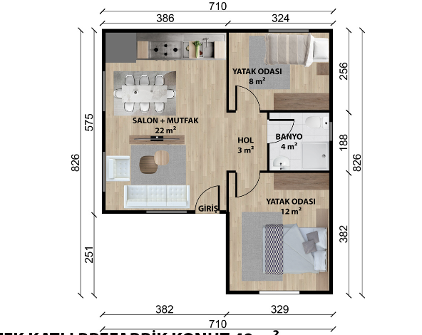 49 m² alana sahip tek katlı prefabrik evimiz, estetik ve fonksiyonelliği bir araya getirerek modern yaşam ihtiyaçlarınıza mükemmel bir şekilde uyum sağlar. 49 m² genişliğindeki yaşam alanı; ferah bir oturma ve yemek düzeni için ideal olan salon + mutfak bölümü, geniş bir yatak odası, bir ek oda veya çalışma alanı ve tüm ihtiyaçlarınızı karşılayacak şekilde tasarlanmış bir banyodan oluşmaktadır. Yüksek kaliteli malzemelerden üretilen bu prefabrik ev, dayanıklılık ve uzun ömürlü kullanım için özel olarak tasarlanmıştır. Yazlık ya da kalıcı konut arayışında olanlar için ekonomik, hızlı ve çevre dostu bir alternatif sunar. Bahçenizde, arazinizde ya da tatil beldenizde huzur dolu bir yaşam kurmak istiyorsanız, bu modern prefabrik ev tam size göre! 49 m²’lik geniş ve işlevsel alanıyla hem konfor hem de estetik bir çözüm sunuyor.