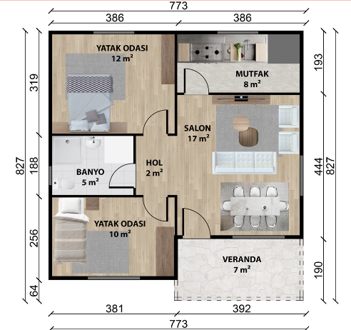 61 m² alana sahip tek katlı prefabrik evimiz, estetik ve işlevselliği bir araya getirerek modern yaşam ihtiyaçlarınıza mükemmel bir şekilde uyum sağlar. 54 m² genişliğindeki iç yaşam alanı; ferah bir oturma ve yemek düzeni için ideal salon + mutfak bölümü, geniş bir yatak odası, bir ek oda veya çalışma alanı ve günlük ihtiyaçlarınızı karşılayacak şekilde tasarlanmış bir banyodan oluşmaktadır. Ayrıca 7 m² büyüklüğündeki veranda, açık havanın keyfini çıkarabileceğiniz huzurlu bir alan sunar. Yüksek kaliteli malzemelerden üretilen bu prefabrik ev, dayanıklılık ve uzun ömürlü kullanım için özel olarak tasarlanmıştır. Yazlık ya da kalıcı konut arayışında olanlar için ekonomik, hızlı ve çevre dostu bir alternatif sunar. Bahçenizde, arazinizde ya da tatil beldenizde huzur dolu bir yaşam kurmak istiyorsanız, bu modern prefabrik ev tam size göre! 54 m²’lik işlevsel iç alanı ve 7 m²’lik geniş verandasıyla konforlu bir yaşam sunuyor.