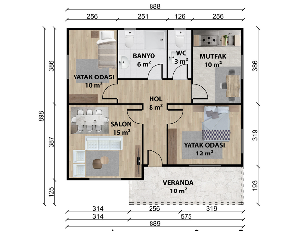 74 m² alana sahip tek katlı prefabrik evimiz, geniş ve modern yaşam alanlarıyla konforlu bir yaşam sunar. 64 m² iç yaşam alanı; ferah bir salon + mutfak bölümü, iki geniş yatak odası, bir ek oda veya çalışma alanı ve günlük ihtiyaçlarınızı karşılayacak şekilde tasarlanmış bir banyodan oluşmaktadır. Ayrıca 10 m² büyüklüğündeki veranda, açık havanın keyfini çıkarabileceğiniz harika bir alan sunar. Yüksek kaliteli malzemelerden üretilen bu prefabrik ev, dayanıklılık ve uzun ömürlü kullanım için özel olarak tasarlanmıştır. Hızlı ve kolay kurulum avantajıyla, yazlık ya da kalıcı konut arayışında olanlar için ekonomik ve çevre dostu bir çözüm sunar. Bahçenizde, arazinizde ya da tatil beldenizde huzurlu bir yaşam kurmak istiyorsanız, bu modern prefabrik ev tam size göre! 64 m² işlevsel iç alanı ve 10 m² geniş verandasıyla hem konfor hem de estetiği bir araya getiriyor.